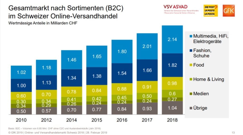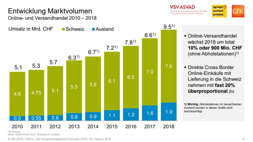 - 2018 kauften Schweizer Konsumenten für 9.5 Mrd. Franken Waren und Güter online, eine Steigerung um 10 Prozent gegenüber 2017