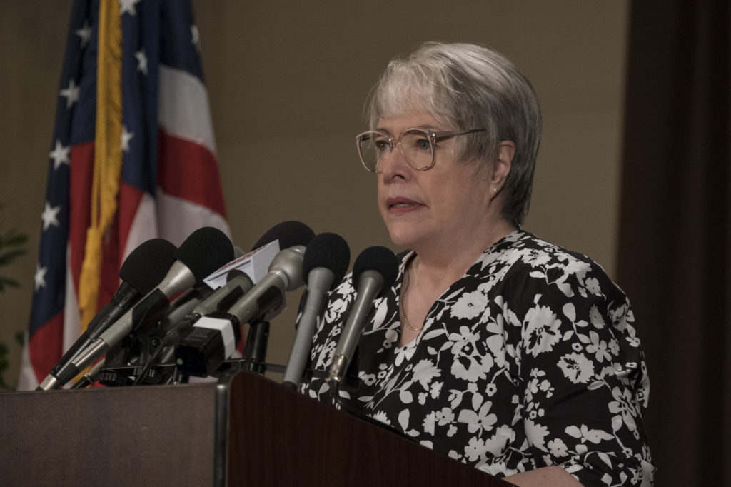 Richards Mutter Bobi (Kathy Bates) bei ergreifender Rede vor Reporter-Meute (Foto zVg)