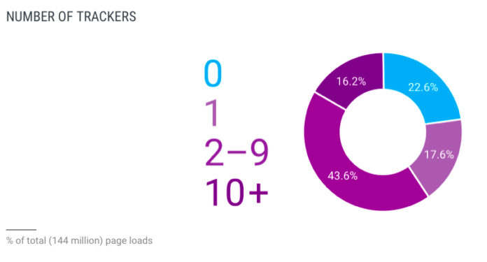 Am verbreitetsten sind laut der Erhebung die Tracking-Skripte von Google (60,3 Prozent der Seitenaufrufe) und Facebook (27,1 Prozent). Darüber hinaus konnte Ghostery Tausende weitere Tracking-Skripte identifizieren, die ein Risiko für die Privatsphäre darstellen und die Ladezeiten von Websites verlängern. Auf den meisten Seiten sind gleich mehrere Tracking-Skripte aktiv. So erheben auf ungefähr zehn Prozent der Websites beziehungsweise bei 15 Prozent der Seitenaufrufe zehn oder mehr Unternehmen (Unique Tracking Domains) Daten.
