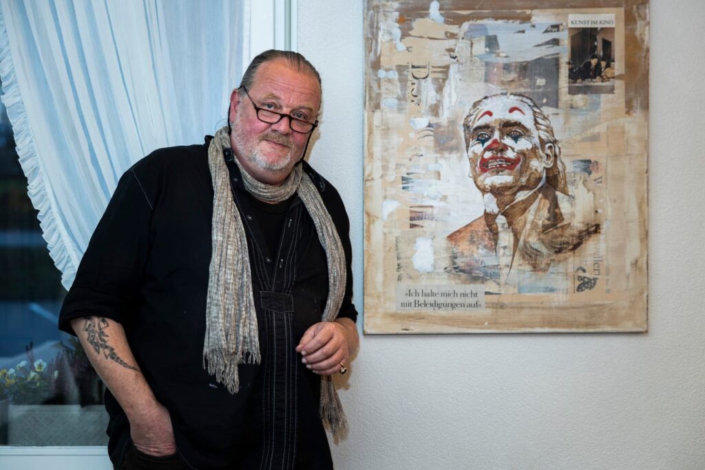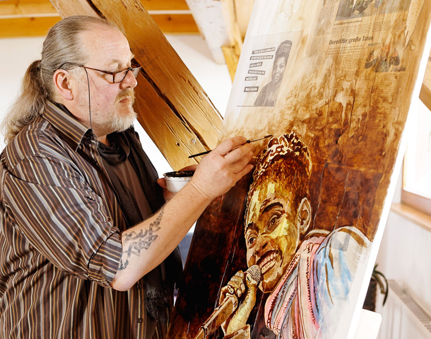 Als zweite, ebenbürtig faszinierende und illustere Kunst-Persönlichkeit des Abends empfing der auch „Master Coffee“ genannte Marcel Wagner in den inspirierenden Hallen der AHA Aeschbachhalle Aarau/AG. Mit Hintergrund einer Zeitung auf eine 30x40cm grosse Leinwand appliziert, malt Marcel in Manier eines Tagebuches seit 2017 JEDEN TAG mit Kaffee und Gouache ein mitreissend bezauberndes Kunstbild! „Flüchtigkeit und Vergängliches, das die Menschheit täglich in den Medien überschwemmt, wird damit stets zu fragender, provozierender oder ganz einfach ästhetischer Momentaufnahme – mithin Symbolbilder über den Schwebezustand des Menschen!“, so Marcel.