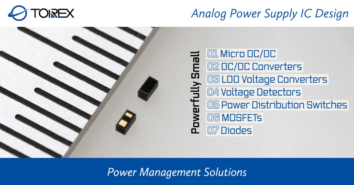 Torex ist ein Spezialist für analoge CMOS und Stromversorgungs-ICs. Die vielseitigen Ultra-Low-Power Bauelemente von Torex haben einen extrem kleinen Footprint und eignen sich ideal für Anwendungen in der Industrie, der Automatisierung, im IoT, in Wearables, der E-Mobilität und im nachhaltigen Energiesektor.