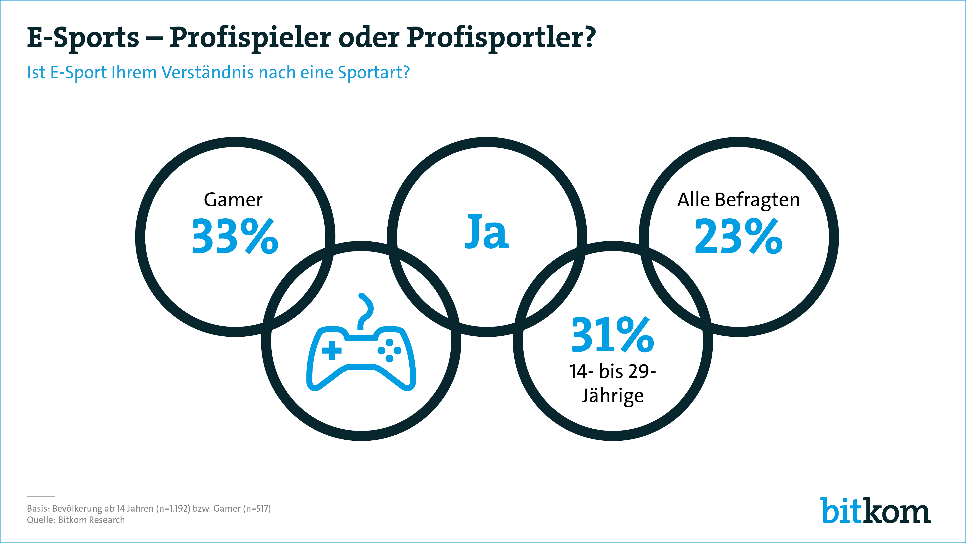 So sagt mehr als jeder fünfte Deutsche (23 Prozent), dass E-Sport seinem Verständnis nach ebenso eine Sportart ist wie Fussball, Handball oder Schwimmen. Unter den Gamern ist sogar jeder Dritte (33 Prozent) dieser Meinung. Das ist das Ergebnis einer repräsentativen Befragung, die der Digitalverband Bitkom in Auftrag gegeben hat. „E-Sport boomt. In der stetig wachsenden Szene werden hunderte Millionen Euro umgesetzt und auch E-Sportler füllen mittlerweile grosse Hallen begeisterter Anhänger. Dazu kommen Millionen Fans, die per Livestream die Spiele verfolgen“, sagt Bitkom-Hauptgeschäftsführer Dr. Bernhard Rohleder. „E-Sport professionalisiert sich und immer mehr grosse Vereine bauen E-Sport-Abteilungen auf.“ So hat in der Bundesliga der VfL Wolfsburg ein FIFA E-Sport-Team genauso wie der FC Schalke 04 und der VfB Stuttgart. Auch in die Wahlprogramme einiger Parteien haben es der E-Sport und seine Rahmenbedingungen mittlerweile geschafft.