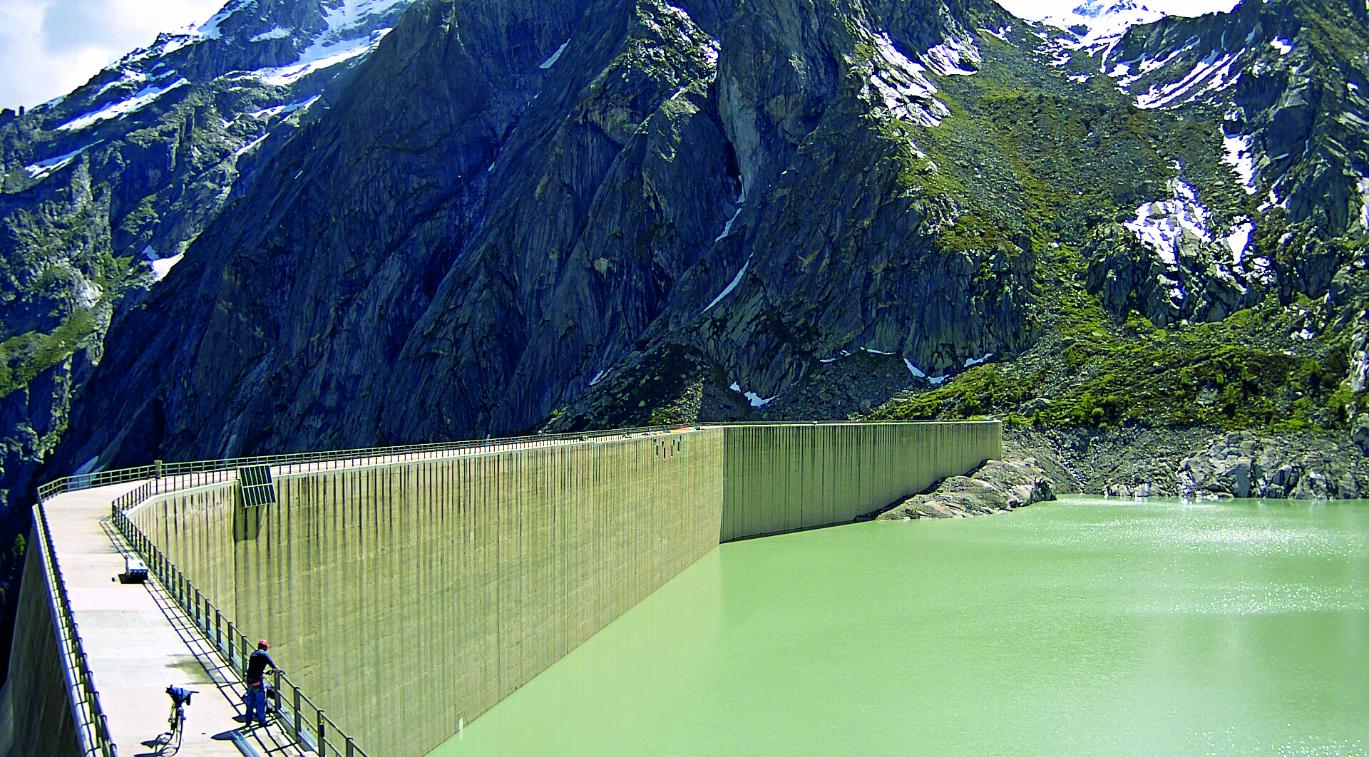 Rund sechs Kilometer Kabel sollen 1’200 Photovoltaik (PV)-Module verbinden, um ab September Solarstrom von 2’100 M.ü.M. ins Netz einzuspeisen. Damit will ewz einen Beitrag zur Energiewende, zum Umwelt- und Klimaschutz leisten. In den nächsten Wochen soll die Unterkonstruktion gebaut und die Solarmodule auf rund 670 Metern unterhalb der nach Süden gerichteten seeseitigen Mauerkrone montiert werden. Für einzelne Arbeitsschritte soll ein Brückenuntersichtsgerät eingesetzt werden, damit die ewz-Mitarbeitenden die Profile für die Unterkonstruktion an der Staumauer befestigen können.