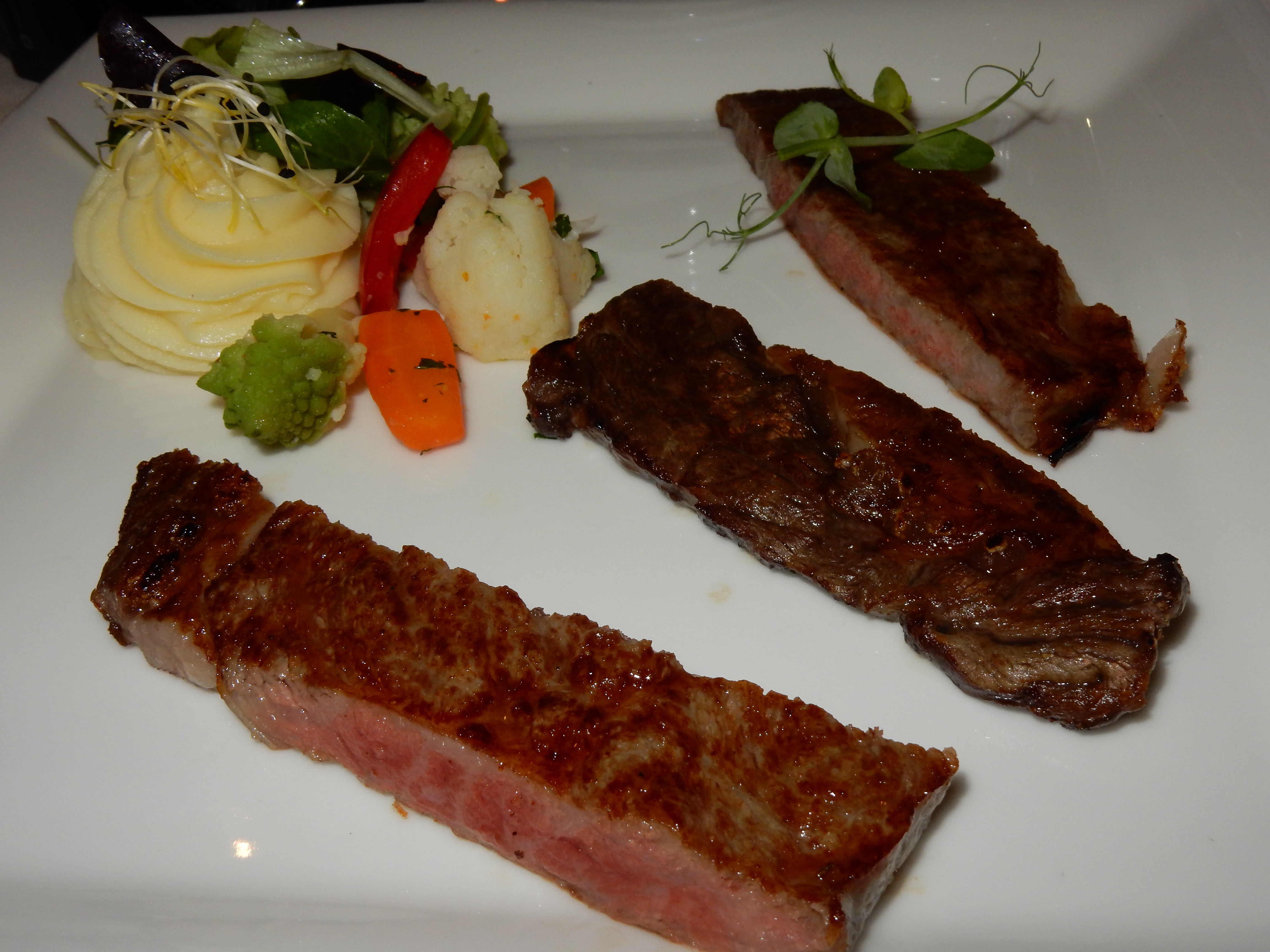 - WAGYU TASTING: Wagyu Südtirol/Rib Eye – Kobe Beef/Marmorierung 10+/Rib Eye – Kagoshima Beef/Marmorierung 11/RibEye – in Begleitung von tourniertem Gemüse & sautierten Kartoffelwürfeln