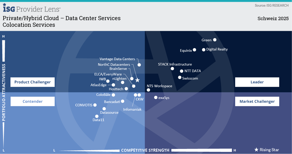 ISG, ein weltweit tätiges Technologieforschungs- und Beratungsunternehmen mit Schwerpunkt auf künstlicher Intelligenz, untersuchte in der unabhängigen Studie «Private/Hybrid Cloud – Data Center Services 2025» den Schweizer Rechenzentrumsmarkt. Green erreichte erneut den Leader-Status und positioniert sich zum sechsten Mal in Folge an der Spitze beider Bewertungsdimensionen: Wettbewerbsstärke und Portfolioattraktivität. Die ISG-Studie bewertete nebst Datacenter-Design, Sicherheitsstandards, Netzwerkangebot und Nachhaltigkeit auch die technologische Zukunftsfähigkeit der Rechenzentren.