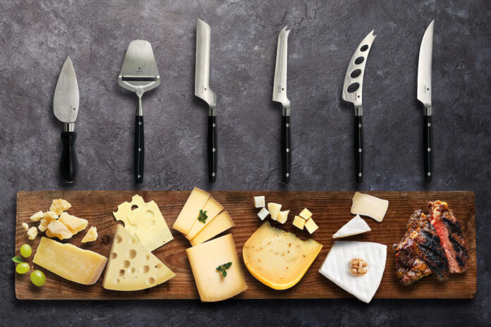 Das Weichkäsemesser eignet sich hervorragend zum Schneiden von Frischkäse wie Mozzarella, Blauschimmelkäse wie Roquefort oder sortentypisch Camembert, Brie de Meaux, Caprice des Dieux und Konsorten. Denn dessen hohle Klinge verhindert das Ankleben solcher Sorten. Hartkäse wie Gruyère, Comté oder Cheddar wiederum werden ideal vom Spezialmodell mit breiter Klinge getrennt. Während für halbharte Käse wie Emmentaler, Appenzeller oder Gouda das Universalmesser mit abgeschrägter Spitze zur Anwendung gelangt. Sodann gehören zum Sortiment ebenso ein Sbrinz- (die wenigsten wissen, dass dieser einiges vor dem Parmesan „das Licht der Welt erblickte“!) oder Hobelkäse-Messer sowie ein Hobel mit flexibler Klinge aus speziellem Federstahl. „Last but not least“ sind Fleischliebhaber dank der mikroverzahnten Halbsägeklinge für Steaks und Würste gut bedient.