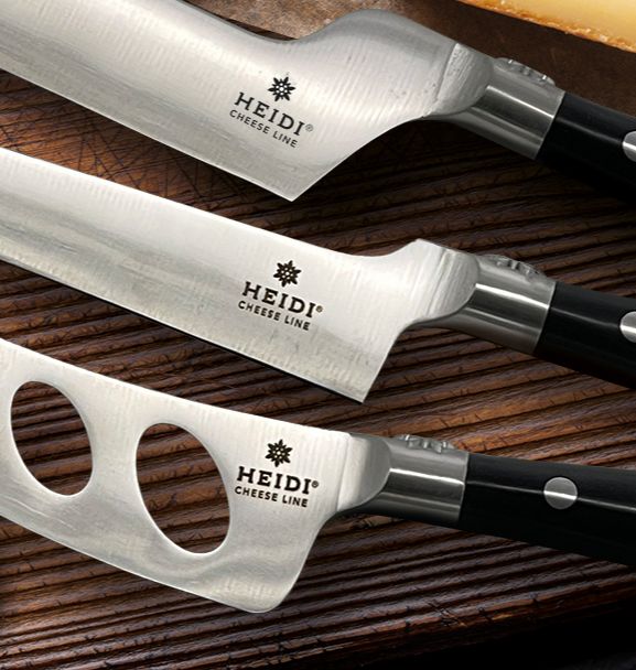 Kein Zweifel, Heidi Cheese Line ist ein „brand“ der sich dem Käse in allen Formen verschrieben hat: Mit Caquelons, Raclette-Spachteln, Schneidebrettern und einigem mehr erfüllt sie sämtliche Käseträume. Aktuell wird das Sortiment um die neue Messerlinie erweitert, die aus extrem scharfen Klingen von Molybdän-Vanadium-Edelstahl und einem handlichen Griff aus drei Metallnieten besteht.