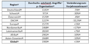 Auch Deutschland (-5 Prozent auf 1141 Angriffe) und Österreich (-4 Prozent auf 1570 Angriffe) verzeichneten Rückgänge, womit die gesamte DACH-Region im September im Schnitt 1227 Angriffe pro Woche registrierte – ein Minus von 10,5 Prozent im Vergleich zum August. Für die stark betroffene Schweiz ist dieser Rückgang ein deutliches Signal, dass sich die Präventionsmassnahmen vieler Unternehmen auszahlen könnten.