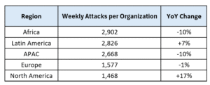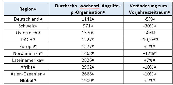 Im globalen Vergleich bleibt das Niveau der Angriffe jedoch hoch. Weltweit wurden im Durchschnitt 1900 Attacken pro Organisation und Woche gezählt – ein leichter Rückgang gegenüber dem August, aber immer noch ein Prozent mehr als im Vorjahr. Afrika (2902 Angriffe) und der asiatisch-pazifische Raum (2668 Angriffe) bleiben die am meisten attackierten Regionen, während Nordamerika mit einem Anstieg von 17 Prozent den grössten Zuwachs verzeichnete.