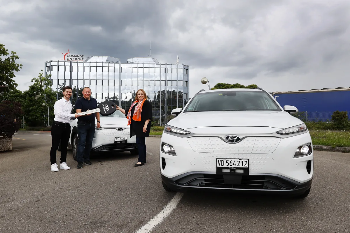 Romande Energie SA übernahm im Juli 2021 die Schlüssel von zwanzig neuen Hyundai KONA Electric. Der Wechsel vom Verbrennungsmotor auf elektrisch angetriebene Fahrzeuge sei Teil der Umweltstrategie, mit der das Unternehmen zur Dekarbonisierung der Westschweiz beiträgt.