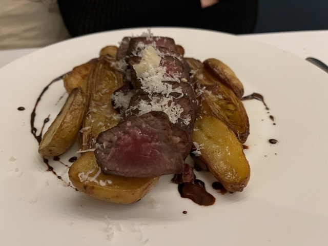 Die von einer jüngeren, aufmerksamen und herzlichen weiblichen Servierkraft kredenzten Vorspeisen aus einmal «Foie gras d’oie» mit Birnenschnitzen und Feigen-Chutney sowie ein Carpaccio aus Jakobsmuscheln mit Granatapfelkernen, usw. munden vorzüglich! Prima auch das Entrée «Linsensuppe mit Crème fraîche»-Tupfer in der Mitte des Tellers. Hervorragend sodann die Hauptspeisen, bestehend aus einem «Magret de Canard» (Entenbrust) an einer «Glace de Viande» (reduzierter Fleischfond) mit Kartoffel-Gnocchi auf Blattspinat sowie einem in Scheiben geschnittenen Rindshuft-Filet mit saisonalem Kräutermantel auf Bratkartoffeln: Zubereitung beider Fleischstücke zwar noch etwas «bissig», aber hervorragend abgeschmeckt. Zum Dessert dann einmal eine kleine Käseauswahl für den Autor dieser Zeilen, Edelfrüchte auf Meringues-Baisers für die ihn begleitende Wein-Expertin Marina Kamm.