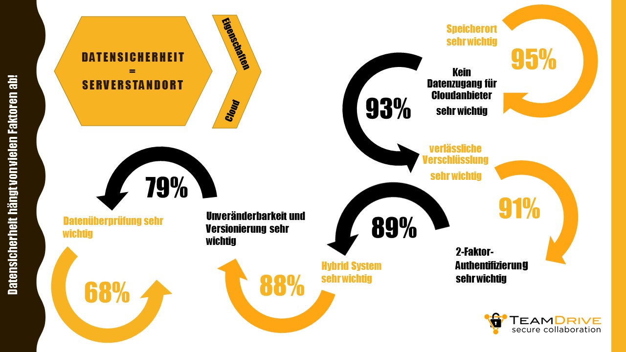 Die Befragung wurde im Auftrag der TeamDrive Systems GmbH im Rahmen der diesjährigen IT-Security Messe it-sa durchgeführt. Auf die Frage nach den wichtigsten Eigenschaften eines Cloud Anbieters in Punkto Sicherheit nannten die Befragten nach dem genannten Speicherort der Daten (95%) das Zero Knowledge System, das dem Cloud-Anbieter jeglichen Zugang zu Daten verwehrt (93%) sowie eine verlässliche Ende-zu-Ende Verschlüsselung (91%).
