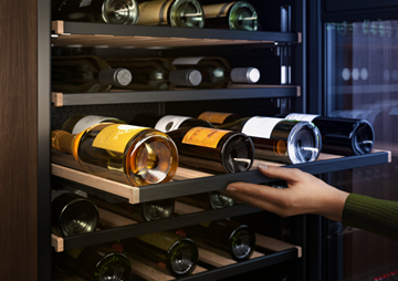 Im Weinschrank können bis zu 40 Flaschen gelagert werden. Sogar Champagner- und Magnumflaschen finden problemlos ihren Platz. Möglich macht es das Perfect Shelving System mit ausziehbaren Ablagen aus hochwertigem Holz mit optimierten Regalabständen. So können Flaschen jeder Grösse und Form einfach gelagert und entnommen werden, ohne die Etiketten dabei zu zerkratzen. Der Weinschrank eignet sich nicht nur für die Lagerung. Dank zwei individuell regulierbaren Klimazonen können die Weine entsprechend den eigenen Vorlieben temperiert werden. So stehen die Lieblings-Tropfen jederzeit servierbereit zur Verfügung – für grosse Feste oder spontane Gäste.