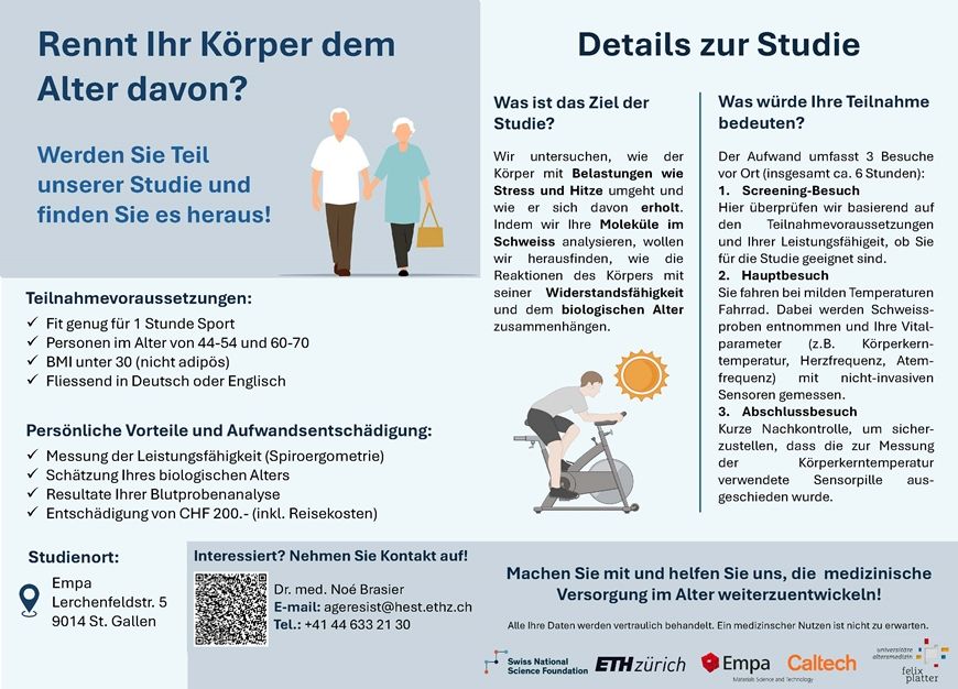 Mit Biomarkern im Schweiss wollen Forscher der ETH Zürich, der Empa, des Caltech (California Institute of Technology) und des Universitätsspitals Basel das biologische Alter präzise und einfach messbar machen. Das Projekt «AGE RESIST» wird vom Schweizerischen Nationalfonds (SNF) unterstützt.