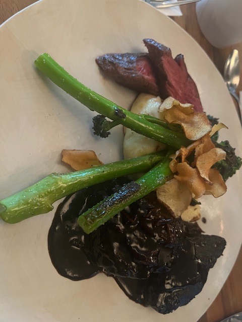 - Als Hauptgang dann zweierlei vom Rind, Topinambur, schwarzer Knoblauch, Bimi und La Ratte zu ZWEI Abfüllungen: Die erste ein Château Clos Lavizon Prestige ’20 aus 100% Merlot (sortenrein): Schon dessen Nase und Farbe optimal, im Munde sanft und tanninhaltig sowie mit vollem Fruchtkörper und subtilen Eichenfassnoten ausbalanciert; die zweite ein Château Montgaillard – Grande Cuvée ’22 der Weinberge Chollet in Assemblage aus Merlot & Cabernet Sauvignon: Dieser begeisterte mit tiefroter Farbe, intensiven Aromen von Tabak und Vanille sowie feinen Holzanklängen. Am Gaumen vollmundig, samtig, strukturiert und elegant. Beide Cuvées unterstrichen ihrerseits die Hochzeit der je einmal GESCHMORTEN und GEGRILLTEN Rindshuft/-schulter: Ein Gedicht!